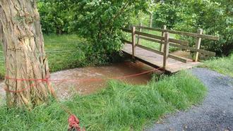 Auch wurde eine Holzbrücke über den Angerbach in der Friedrich-Rückert-Anlage gesichert, damit diese nicht wegtreibt und verkeilt und zu weiterem Wasseranstau führt. Leider wurde von den Sicherungsseilen ein Leinenbeutel entwendet. Wir bitten, diesen an die Feuerwehr zurückzugeben.