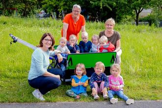 Auf ihren ersten großen Ausflug mit dem Krippenwagen freuten sich die 8 Spatzenkinder der Kindertagesstätte Jesserndorf besonders. Jetzt im Juni ist es endlich so weit gewesen, und der neu angeschaffte, motorisierte Krippenwagen konnte getestet werden. Es finden jetzt alle 8 Kinder im grünen Wagen einen Platz und bei starker Sonneneinstrahlung gibt es außerdem die Möglichkeit einer Beschattung. Dadurch steht auch längeren Spaziergängen und Ausfahrten durch Jesserndorf zu Hühnern, Kühen und in die Natur nichts mehr im Weg. Besonderer Dank für diese Initiative gilt dem Elternbeirat der Kindertagesstätte sowie allen engagierten Eltern, die auch am Weihnachtsmarkt fleißig Lose verkauft und Spenden gesammelt haben. Danke an alle Spender vom Weihnachtsmarkt! Durch die großzügige Unterstützung des Kolpingvereins Unterpreppach, Team AquaTec Ebern, Metzgerei Hümmer, Hans Batzner GmbH Ebern, Fam. Heinz Fausten, Tierarztpraxis Mußmächer, Spendenaktion vom Bramberger „Mahnfeuer“ und der Stadt Ebern konnten die benötigten Mittel aufgebracht werden. Die Kinder und Erzieherinnen möchten sich recht herzlich bei allen Sponsoren bedanken, sowie bei allen Beteiligten, die das Projekt mit unterstützt haben. Wir freuen uns riesig und wünschen „Allzeit gute Fahrt“ und viel Spaß bei allen Unternehmungen!
