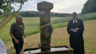 Der evangelische Pfarrer Holger Manke, rechts, und der Ortskundler und Wanderwart Heinz Fausten bei der Einweihung des Brunnens am alten Wasserhäuschen. Voraus ging ein ökumenischer Gottesdienst am Dorfgemeinschaftshaus. Der Haßbergverein hat mit der Dorfgemeinschaft Jesserndorf einen Laufbrunnen am alten Wasserhäuschen am Steinert erstellt. Die Quellen am Steinert versorgten Jesserndorf lange mit Trinkwasser, bis zum Anschluss an die Trinkwasserversorgung Ebern. Das ablaufende Wasser wird nun über einen Brunnen geleitet. Es ist ein schöner Ort entstanden, der zum Rasten nach einer Wanderung einlädt. Gefördert wurde das Projekt mit Mitteln des Regionalbudgets der Baunach-Allianz.