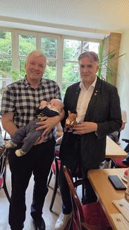 Bürgermeister Jürgen Hennemann hält einen "Neueberner", 2. Bürgermeister Harald Pascher hält das Eberner Maskottchen, Plüschtier "Lützel", das allen Babys als Geschenk mitgegeben wurde.