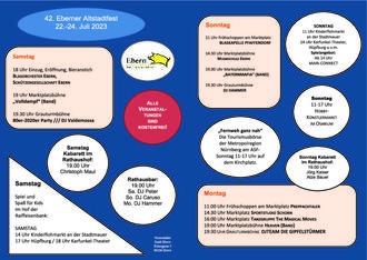 Das 42. Eberner Altstadtfest steht vor der Tür und verspricht ein unvergessliches Wochenende voller Spaß, Musik und Unterhaltung für die ganze Familie zu werden. Vom 22. bis 24. Juli 2023 bietet das Altstadtfest ein abwechslungsreiches Programm für Besucher jeden Alters. Mit einem Mix aus traditionellen Highlights und neuen Attraktionen wird das Fest wieder Tausende von Gästen aus Nah und Fern in die wunderschöne Altstadt von Ebern locken.