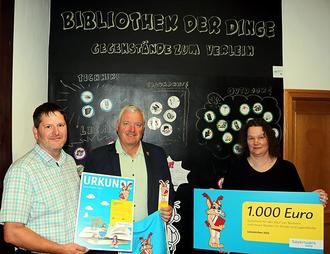 Urkunde und Spendenscheck wurden von Christian Ziegler (links) an Andrea Bols und Bürgermeister Jürgen Hennemann (von rechts) in der Bücherei übergeben.