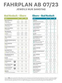 Neben der Aufnahme des Bad Rodacher Stadtteils Gauerstadt wird nun auch ab Juli 2023 die Veste in Heldburg als Haltestelle angefahren. In diesem Zusammenhang wurden die Abfahrtszeiten generell angepasst. Die Haltestellen in Dürrnhof, Lichtenstein und Eyrichshof werden zukünftig in Fahrtrichtung von Bad Rodach nach Ebern "bei Bedarf" angefahren. Hier ist eine Anmeldung bis spätestens eine Stunde vor planmäßiger Abfahrtszeit beim durchführenden Verkehrsunternehmen erforderlich. Auch die Mitnahme von Fahrrädern ist weiterhin nach Voranmeldung möglich.