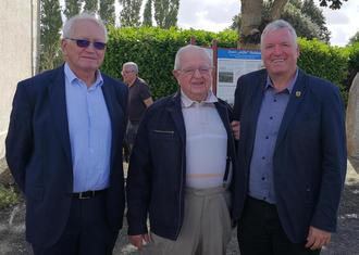 Michel Lefèvre in der Mitte zwischen Bürgermeister Jacques Prigent aus Trun (links) und Bürgermeister Jürgen Hennemann aus Ebern in Tournai-sur-Dives vor der für die Heldentat aufgestellten Tafel: „Zwei stille Helden“