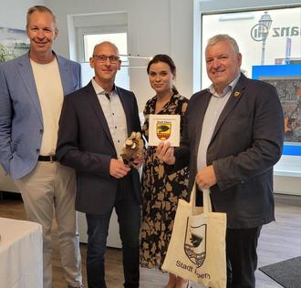 Am Freitag, den 23.06.2023 fand die offizielle Eröffnungsfeier der Allianz Hauptvertretung Harald Fleischmann in der Kapellenstr. 22 statt. Wir als Stadt Ebern heißen Herrn Fleischmann in Ebern herzlich willkommen und freuen uns, dass er sich für den Bürostand Ebern entschieden hat und somit die Allianz Versicherung auch weiterhin vor Ort für ihre Kunden da sein kann. Natürlich durfte ich als 1. Bürgermeister Herrn Fleischmann auch unsere Ebern-Bag mit wissenswerten Informationen über unsere schöne Stadt Ebern, sowie unserem Stadtwappen und das Stadtmaskottchen „Lützl“ im Namen aller Bürger und Bürgerinnen übergeben. Für die Zukunft wünschen wir Herrn Fleischmann viel Erfolg und hoffen, dass er der Stadt Ebern noch lange erhalten bleibt.