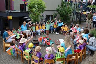 Dies war eines der Lieder, dass die Kinder der städtischen Kita „Kuckucksnest“ am 50-jährigen Jubiläum eingeübt hatten. Die bunt gekleideten Kindergarten- und Krippenkinder eröffneten das Fest mit einem feierlichen Einzug. Andrea Schuhmann, Leitung der Einrichtung, begrüßte alle Gäste, Ehemalige, Helfer, Gönner, Elternbeirat, Träger und Eltern zu diesem großen Fest und bedankte sich ausdrücklich bei allen Spendern und Gönnern, die unsere Kita unterstützen.