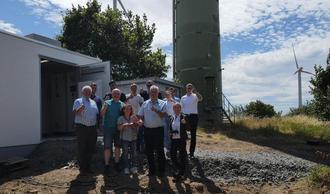 Teilnehmerinnen und Teilnehmer der technischen Inbetriebnahme der neuen Bürgerwindanlage am Bretzenstein am 24. Juni 2025. Bürgermeister Helmut Dietz (Gemeinde Untermerzbach), Bürgermeister Jürgen Hennemann (Stadt Ebern), Elfriede Grell (symbolischer „Steckeranschluss“), Reinhold Zeilinger (Geschäftsführer Naturenergie Zeilinger GmbH), Katrin Held (Geschäftsführerin Naturenergie Zeilinger GmbH), Theodor Schell (technischer Mitarbeiter), Markus Prath (Bayernwerk Netz GmbH), Herr Stumm (E-TEC GmbH), Martin Haubner (Vertreter der finanzierenden Genossenschaftsbank).