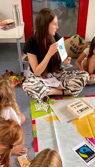 Laura Späth stellt den Kindern einige faire Siegel vor