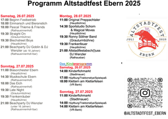 Nun steht das Programm zum Altstadtfest Ebern fest. Der Festwirt Kai Hofmann hat wieder ein interessantes Programm zusammengestellt, bei dem auch Neuerungen eingeflossen sind. So findet dieses Jahr im Rathaushof eine Beach-Party am Sonntag für alle Teenies und am Samstag ab 18 Jahren statt. Auch das Kulturprogramm ist wieder an seinem traditionellen Platz im Rathaushof.