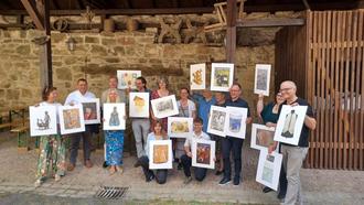 Die Vertreter der unterfränkischen Museen mit den Exponaten, die auf Wanderschaft gingen, im Hof des Heimatmuseums.