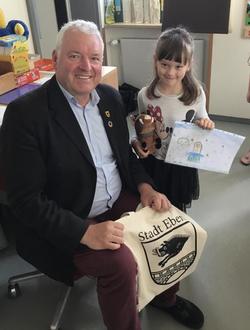 Jetzt wurden die kleinen Künstler durch den Bürgermeister in ihren Kindergärten besucht und ihr Gewinnerbild mit kleinen Geschenken, eine faire Stadtschokolade, den Stadtcomic sowie ein Pixi-Heft zur Arbeit des Bürgermeisters, überreicht. Besonders gut kam immer das faire Stadtmaskottchen, das Plüschtier "Lützel", an, das die Kinder sichtlich stolz entgegennahmen. Herzlichen Dank nochmals an die kleinen Künstler!