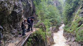 Weiter auf dem Programm stand für die Eberner Besucher ein Ausflug zur Kaiserklamm bei Aschau mit einer kleinen Wanderung durch die Klamm. Trotz Regen und Nässe von allen Seiten war die Begehung der Klamm ein Erlebnis. Auf gesichertem Weg mussten einige Hürden überwunden werden, die die Teilnehmer aber gut meisterten, bevor die Mittagseinkehr bei Speckknödel und Kaiserschmarrn angegangen werden konnte. Bürgermeister Karl Eberharter begleitete die Eberner und erläuterte die Erschließung der Klamm. Hier sei früher Holz geflößt worden, eine gefährliche Arbeit.