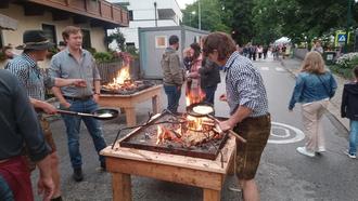 Melchermuas, ein nahrhaftes bäuerliches Gericht, das für hart arbeitende Menschen gedacht war, bereiteten die Jungbauern am Dorfplatz zum Jubiläum zu. Dieses wird über offene Feuer in Eisenpfannen aus Milch, Mehl und viel Butter zubereitet. Lecker aber kalorienreich.