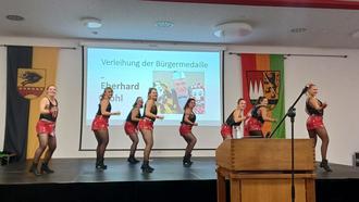 Er berichtete von gut vorbereiteten Vorstandssitzungen, genauen Zeitvorgaben und so manchen Missgeschicken bei den Faschingsveranstaltungen. Er schloss mit: „Ein bisschen Fasching muss heut’ Abend auch sein, drum lassen wir die Heubacher Garde gleich rein.“ Und acht Tänzerinnen der Garde aus Heubach kamen auf die Bühne und entzündeten ein wahres Feuerwerk aus Akrobatik und Tanz - sehr zur Freude des überraschten Geehrten und der Gäste.