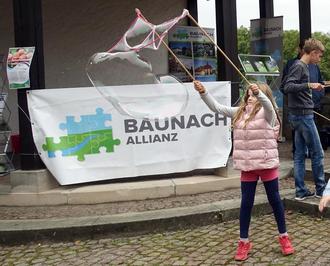 Zum Apfelfest der Stadt Ebern präsentierte sich die Baunach-Allianz mit einem Stand im Innenhof des alten Rathauses. Sabine Fuchs, Managerin für Biodiversität, überraschte das Publikum mit Riesenseifenblasen als Mitmachaktion für Groß und Klein. Doch was haben die Seifenblasen mit Artenvielfalt zu tun? Seifenblasen könnten in Zukunft dafür sorgen, dass unsere Obstbäume, trotz fortschreitendem Rückgang an bestäubenden Insekten, weiterhin Früchte tragen. Vielfalt und Anzahl unserer nützlichen „Brummer“ ist seit einigen Jahren stark rückläufig. Kann man sie ersetzen?