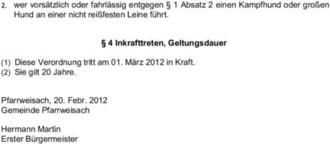 Wie in vielen anderen Städten und Gemeinden gilt in der Gemeinde Pfarrweisach auf allen öffentlichen Anlagen und auf allen öffentlichen Wegen, Straßen und Plätzen innerhalb der im Zusammenhang bebauten Ortsteile seit 01. März 2012 eine allgemeine Leinenpflicht für Kampfhunde und große Hunde (ab 50 cm Schulterhöhe). Dies scheint gelegentlich in Vergessenheit zu geraten oder noch nicht bei allen Hundehaltern angekommen zu sein. In diesem Zusammenhang weisen wir darauf hin, dass vorsätzliche oder fahrlässige Verstöße gegen die geltende Verordnung eine Ordnungswidrigkeit darstellen und mit Geldbuße belegt werden können.