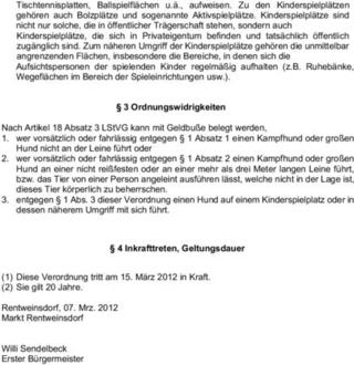 Wie in vielen anderen Städten und Gemeinden gilt im Markt Rentweinsdorf auf allen öffentlichen Anlagen und auf allen öffentlichen Wegen, Straßen und Plätzen innerhalb der im Zusammenhang bebauten Ortsteile seit 15. März 2012 eine allgemeine Leinenpflicht für Kampfhunde und große Hunde (ab 50 cm Schulterhöhe). Dies scheint gelegentlich in Vergessenheit zu geraten oder noch nicht bei allen Hundehaltern angekommen zu sein. In diesem Zusammenhang weisen wir darauf hin, dass vorsätzliche oder fahrlässige Verstöße gegen die geltende Verordnung eine Ordnungswidrigkeit darstellen und mit Geldbuße belegt werden können.