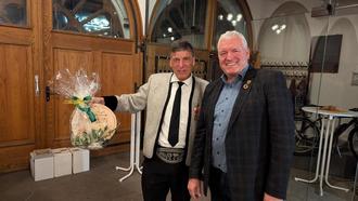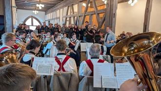 Zum Abend mit einem gemeinsamen Essen in der Rathaushalle gehörten zwar einige Formalitäten wie der Austausch von Gastgeschenken, aber letztlich stand auch hier die Geselligkeit im Vordergrund, musikalisch untermalt von den "Haßberglern". Der Abend klang im Musikheim des Blasorchesters aus, und dem Vernehmen nach reichte der Abend für manche tief in die Nacht. Das Blasorchester Ebern hatte zudem sowohl am Samstagabend als auch am Sonntagvormittag die Bewirtung im Rathaus übernommen.