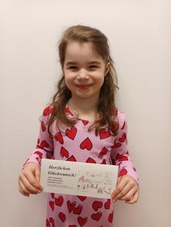 Die strahlende Siegerin Emma Barthelmann des Malwettbewerbs der Stadt mit ihrem Bild, das die Glückwunschkarte der Stadt Ebern für ein Jahr ziert.