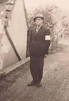 Polizeibeamter im Jahr 1945. Die Polizisten hatten anfangs noch keine Uniform und wurden lediglich durch eine Armbinde gekennzeichnet.