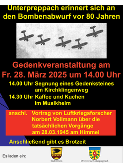 Die Stadt Ebern sowie die Ortsvereine von Unterpreppach laden alle Bürgerinnen und Bürger herzlich zu der Feier ein, bei der nach der Segnung des Steins ein vielfältiges Programm geboten wird. Ab 14:30 Uhr sind die Gäste zu Kaffee und Kuchen eingeladen, um sich in geselliger Runde auszutauschen. Ein besonderer Höhepunkt des Nachmittags ist der Vortrag von Luftkriegsforscher Norbert Vollmann, der im Anschluss auf die historischen Hintergründe des Bombenangriffs und dessen Auswirkungen auf das Dorf eingehen wird. Die Veranstaltung endet mit einer gemeinsamen Brotzeit.
