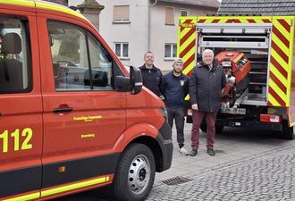 Foto: Jürgen Hennemann Die stolzen Kommandanten Christian Kuhn aus Bramberg (links) und Michael Walz aus Reutersbrunn, die zukünftig mit einem Tragkraftspritzenfahrzeug, statt eines Tragkraftspritzenhängers zu Einsätzen fahren können, mit Bürgermeister Jürgen Hennemann (rechts).