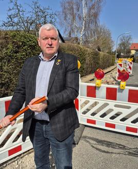 Bürgermeister Jürgen Hennemann hat sich bereits persönlich vor Ort ein Bild vom Start der Bauarbeiten gemacht, hier an der Baustelle im Alten Hohlweg mit einem Glasfaserkabel, das in der gesamten Kernstadt verlegt wird.