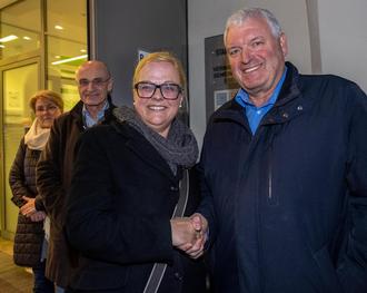 Bürgermeister Jürgen Hennemann gratuliert nach Bekanntgabe des Stichwahlergebnisses zur Bürgermeisterwahl der neugewählten Bürgermeisterin Isabell Zimmer.