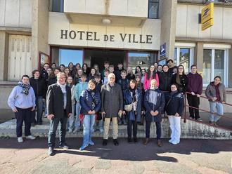 Eine Schülergruppe aus der Realschule und dem Gymnasium konnten mit ihren Lehrkräften Heidi Hauguth und Tanja Roeß zur Wahl gratulieren, da sie über das Wahlwochenende hinweg auf Schüleraustausch in der Normandie waren. Sie übergaben Gastgeschenke an den neuen Bürgermeister und den Schulleiter in Trun. Auf dem Bild mit Bürgermeister Jacques Prigent und Nachfolger Vincent Lebreton, 2. Bürgermeisterin Florence Ecobichon und Lehrer, die den Austausch betreuen. jh