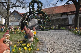 Vier, fünf Jahre mögen es sein, wo der Dorfbrunnen in Pfarrweisach zu Ostern hin „verwaist“ war – jetzt ist er wieder ein Anziehungspunkt vor allem für Familien geworden, mit einer schönen Osterkrone, Girlanden und bunten Eiern und Gartenzwergen. Knapp 50 muntere Kerlchen dieser Spezies tummeln sich rund um die Osterkrone. Dass die Krone dort steht ist eine Initiative der Familien Eisfelder und Stenglein, die die Girlanden gebunden und die Eier aufgefädelt haben rund um ein Metallgerüst, das die vergangenen Jahre zusammengelegt im Bauhof schlummerte. Die Gartenzwerge hat die Familie Rügheimer vom gleichnamigen Hühnerhof gestiftet, die mit dieser Aktion schon jetzt auf ihr Maislabyrinth und auf ihr Hoffest aufmerksam machen wollen, die beide unter dem Thema „Zwerge“ stehen, teilt Roland Rügheimer mit. Die Kosten für die Girlanden und Eier hat der Heimatverein Pfarrweisach übernommen, dazu kommt noch eine private Spende. Und es sind genau 694 Eier, rechnet Ute Eisfelder vor.