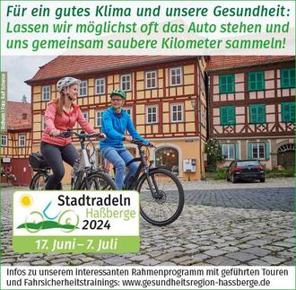 Auch 2024 gibt es das Stadtradeln im Landkreis Haßberge wieder. Unser Aktionszeitraum findet heuer vom Montag, den 17.06., bis Sonntag, den 07.07.2024, statt. Im Aktionszeitraum nimmt der gesamte Landkreis Haßberge als eine Region teil. Die teilnehmenden Radelnden sammeln dabei entsprechend für den Landkreis Kilometer. Sie können hierbei bereits bestehenden Teams beitreten oder eigene Teams gründen. Es wird wieder eine Stadt Ebern Gruppe geben, bei der man sich anmelden kann und Kilometer sammeln kann.