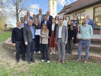 Die Bürgermeister der 11 ILE-Gemeinden der „Baunach-Allianz“ mit den Vertretern der Planer und Behörden mit Vorsitzenden Jürgen Hennemann (vordere Reihe 2. von links), der von Jennifer Gannek die „ILEK-Fortschreibung“ erhält, sowie Umsetzungsbegleiter Felix Henneberger (vordere Reihe rechts).