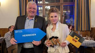 Bürgermeister Jürgen Hennemann übergab das Schild für die 4. Etappe 2025 von Ochsenfurt nach Herrieden an die Bürgermeisterin Dorina Jechnerer. Ein fair produziertes Eberner Maskottchen "Lützel" durfte dabei nicht fehlen.
