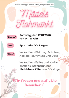 Am Samstag den 17.01.2026 veranstaltet der Kindergarten aus Döckingen den ersten Mädelsflohmarkt in der Sporthalle.