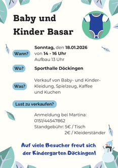 Am Sonntag den 18.01.26 findet in der Sporthalle in Döckingen der Baby- und Kinderbasar auf zwei Ebenen statt.