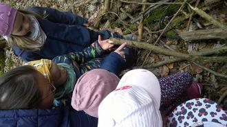 Um 8:30 Uhr ging es, dank Fahrgemeinschaften der Eltern, los in den Wald. Schnell wurde „unser“ Wald angenommen und als erstes ein Waldsofa aus Ästen gebaut. Darauf konnten wir und beim Brotzeit machen setzten. Die Kinder hatten viel Spaß und Freude beim Forschen und Erkunden des Waldes und haben allerhand entdeckt und weiter gebaut. Z.B. ein Wichtelhaus aus Moos, Zweige und Tannenzapfen oder es wurden verschiedenste kleine Tierchen entdeckt und beobachtet.
