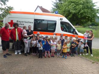 Am 30. Juni 2023 war passend zum Jahresthema der Rettungswagen zu Besuch im Kindergarten. Besonders die Vorschulkinder konnten bei den Sanitätern vieles lernen. Für sie gab es einen Erste-Hilfe-Kurs für Kinder. Die stabile Seitenlage, Verbandswechsel, das Anbringen von Pflastern und vieles mehr waren die Lerninhalte der spannenden Vorschuleinheit. Im Anschluss konnten alle Kindergartenkinder den Rettungswagen von innen und außen genau anschauen. Vieles wurde dabei von den Sanitätern erklärt. Zum Schluss übergaben die Kinder den Sanitätern einen selbstgebastelten Rettungswagen und ein schokoladiges Dankeschön für den tollen Vormittag.