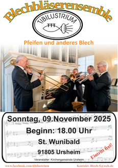 Das Blechbläserensemble "TIBILUSTRIUM" gibt am Sonntag, 9. November 2025, um 18.00 Uhr in der St.-Wunibald-Kirche zu Ursheim ein Konzert.