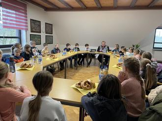 Bürgermeister Heinz Meyer empfing die Schüler und er zeigte ihnen die Büroräume der Verwaltung. Im Sitzungssaal wurden sie dann mit Getränken und Brezen versorgt.