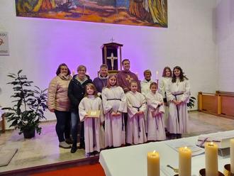 Die Ministrantengruppe der Herz-Jesu-Kirche Pressig freut sich über vier neue Ministrantinnen! Unter der Anleitung ihrer Betreuerinnen Sabine Neubauer und Tanja Fröba wurden Viktoriia Burak, Helena Heinlein, Johanna Heinlein und Sophie Wich über einen Zeitraum von vier Wochen von den Oberministrantinnen Jana Neubauer und Sina Eichenberg in den Ministrantendienst eingewiesen. Im Rahmen des Friedenslichtgottesdienstes am 15. Dezember 2024 wurden die vier neuen Ministrantinnen feierlich durch Dekan Detlef Pötzl in die Gemeinschaft der Ministranten aufgenommen. Gleichzeitig verabschiedete die Pfarrei drei langjährige Ministrantinnen – Magdalena Müller, Anna Louisa Scherbel und Eileen Welscher – aus ihrem Dienst. Als Zeichen der Dankbarkeit für ihren treuen Einsatz über viele Jahre hinweg wurde ihnen ein kleines Präsent überreicht. Die Pfarrei bedankt sich herzlich bei den neuen und scheidenden Ministrantinnen für ihren Einsatz und wünscht allen weiterhin Gottes Segen auf ihrem Weg.