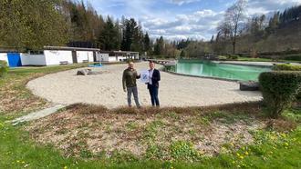 Das Bild zeigt: Das Ratsgremium Pressig beschloss, zukünftig auch ein Trauungszimmer im Grünen am Naturerlebnisbad im idyllischen Landleitenbachtal zu erstellen. Ab Sommer 2024 sollen Eheschließungen im Ambiente des Freibades möglich sein. Bürgermeister Stefan Heinlein (rechts) und Hauptamtsleiter Thomas Frashek freuen sich über die Genehmigung der Standesamtsaufsicht.