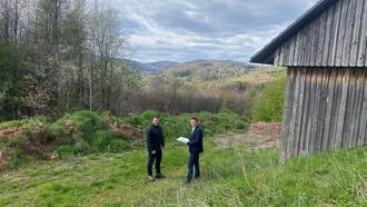 Das Bild zeigt: An diesem Höhenzug zwischen Welitsch und Neukenroth wird eine Mobilfunkstation mit einem 40 Meter hohen Sendemast aus Stahlbeton entstehen. Am Standort freuen sich bei einer Besprechung des Bebauungsplanes, versprechen sich Bauamtsleiter Andreas Schorn (links) und Bürgermeister Stefan Heinlein wesentliche Verbesserungen für Mobilfunkverbindungen.