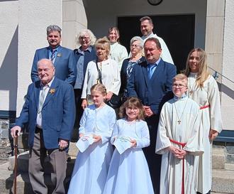 Bei herrlichem Wetter traten am vierten Sonntag nach Ostern in der St. Marien-Kirche in Förtschendorf erstmals zwei Mädchen an den Tisch des Herrn und feierten den Tag ihrer Erstkommunion, die unter dem Motto stand: „Kommt her und esst!“. Mit ihnen feierten auch sechs Jubilare, die sich an ihre erste heilige Kommunion erinnerten. Vor 80 Jahren war hier Horst Ströhlein und vor 75 Jahren Margareta Hofmann zum ersten Mal an den Tisch des Herrn getreten. 60 Jahre ist dies bei Helene Pfadenhauer und bei Hans-Dieter Kropp her. Angela Zipfel erinnerte sich an ihren großen Tag vor 50 Jahren und Heiko Keim vor 40 Jahren. Begleitet von den Orgelklängen zogen die beiden Kommunionkinder und die Jubilare mit Pfarrer Heinz und den Ministranten in das Gotteshaus ein, wo er sie anschließend recht herzlich begrüßte. Dort feierten sie den Festgottesdienst gemeinsam mit ihren Angehörigen und den Gottesdienstbesuchern. In seiner Festpredigt ging Pfarrer Heinz auf das aktuelle Tagesevangelium vom guten Hirten und seinen Schafen aus dem Johannesevangelium näher ein. Den Jubilaren dankte er für ihre Treue zum Glauben.