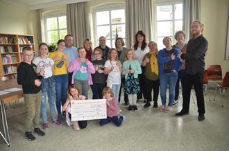 Spendenübergabe in Pressig an den Kinder- und Jugendchor "Happy Tones" in Pressig. Von rechts Chorleiter Erik Meyer, Pfarrerin Claudia Grüning- Göll, weiter ab 4.v.r. hintere Reihe, Melanie Kraus, Isabell Schmidt (Chorgründerinnen und Fördererinnen des Chores), die Leiterin der Theatergruppe Rita Vetter, Brigitte Löffler, Maria Daum, Steffen Bär (alle Theatergruppe) mit den engagierten und begeisterten Sängerinnen und Sängern des Kinder- und Jugendchores "Happy Tones".