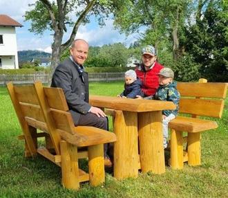Gemeinsam mit dem Bauhofteam wurde ein geeigneter Standort für die Sitzgarnitur gesucht, welcher im Blumenpark gefunden wurde. Dort soll diese einen schönen Platz zum Jausen oder Rasten bieten und zugleich immer an die Freunde aus Pressig erinnern.