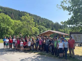 Zum zweiten Familien- Wandertag im Markt Pressig hieß 2. Bürgermeister Wolfgang Förtsch eine stattliche Wandergruppe von über 50 Personen am Wanderkreisel herzlich willkommen. Er entbot die Grüße von Bürgermeister Stefan Heinlein auf dessen Initiative hin die Pressiger Wandertage eingeführt wurden. Förtsch wünschte "gut Fuß" und viel Glück und Freude beim Wandern. Diesmal war das Motto der Wanderung: "Auf Schusters Rappen auf der Suche nach dem Eilazwerg". Der Eilazwerg ist ein sagenumwobenes Fabelwesen, das sich irgendwo auf dem Eilaberg versteckt hält und auch wohl über einen geheimnisvollen Schatz verfügen soll. Der Wanderweg R69 trägt sogar den Namen "Eilazwerg- Weg R69". Dieser führt vom Wanderkreisel am südlichen Ortsausgang von Pressig hinauf auf den Eilaberg, der durch seinen Panoramablick ins Grössautal in nordöstlicher Richtung und gegen Süden ins Haßlachtal beeindruckt und auch zu einer kleinen Pause einlädt. Die beiden Wegewarte, Günter Hanna und Rudi Romig führten die Wandergruppe mit Informationen über den Berg ins Tal nach Eila. Im Wald am Versteck des Eilazwerges gab es dann aus dem Schatz des Eilazwerges einige Snacks. Danach ging es bergab nach Eila. Hier konnte man sich mit Grillspezialitäten und Getränken stärken, denn die Freiwillige Feuerwehr Eila hatte das alljährlich von der FFW Eila organisierte Dorffest vorbereitet. 2. Bürgermeister Förtsch dankte den zwei Wanderwegewarten Günter Hanna und Rudi Romig für die fachkundige Führung, aber auch für die Instandhaltung, Beschilderung und Pflege der Wanderwege, insbesondere für die Ausgestaltung des "Wanderkreisel" mit einer überdachten Sitzgruppe, die erst im Herbst vergangenen Jahres neu installiert wurde. hof