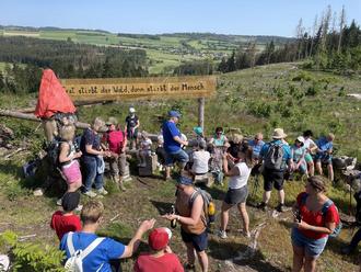 Zweiter Bürgermeister Wolfgang Förtsch (rechts) schickte die stattliche Wandergruppe auf Schusters Rappen auf die Suche nach dem Eilazwerg. Links im Hintergrund der Eilaberg.