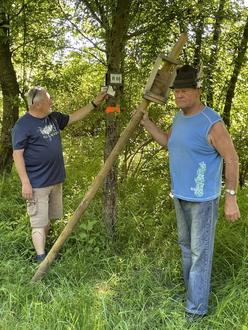 Das Bild zeigt: Sie zeigen sich entsetzt über die Zerstörungswut einiger Vandalen. Ihr mit Leidenschaft, in freiwilliger ehrenamtlicher Arbeit geschaffener Baumlehrpfad, wurde durch Vandalen zunichte gemacht. Von links Günter Hanna, Georg Pabstmann