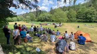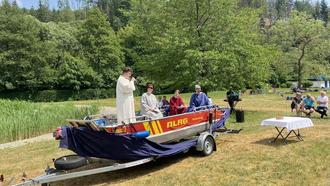 Im Naturbad in Rothenkirchen gab es kürzlich eine Premiere: dort wurde der ökumenische Gottesdienst „Quicklebendig“, ein Gottesdienst für die ganze Familie, gefeiert. Passend zum Gottesdienstort hatte das Quicklebendig-Team dafür natürlich eine biblische Geschichte ausgesucht, in der Wasser eine Rolle spielt. Es wurde die Geschichte von der Sturmstillung in einem Anspiel erzählt. Jesus gerät mit seinen Freunden in einen Sturm auf dem See Genezareth. Die Freunde bekommen Angst und bereuen, dass sie überhaupt losgefahren sind. Sie rufen um Hilfe. Jesus, der hinten im Boot liegt und schläft, bleibt ruhig und gelassen: „Warum habt ihr so große Angst? Warum vertraut ihr nicht auf meine Hilfe und auf die Kraft Gottes?“ Mit von der Partie war auch die Kirchenquasselkunni, ein frech-fröhlicher Vogel, der manchen Kindern schon aus dem Kindergottesdienst bekannt war. Kunni ist pfiffig und weiß immer einen Rat: Wenn man im oder auf dem Wasser in Not gerät, dann hilft die DLRG. Und so kommt auch sogleich der Stefan (Bürgermeister Stefan Heinlein) von der DLRG. Der aber weiß, dass man in Situationen geraten kann, die die eigenen Kräfte und Möglichkeiten übersteigen, in denen man auf die Hilfe von Jesus und auf die Kraft Gottes angewiesen ist. „SOS an Jesus“ muss man dann rufen. Klasse war, dass für das biblische Anspiel ein echtes Rettungsboot der DLRG auf dem Rasen stand. Die kleinen und großen Gottesdienstbesucher stimmten anschließend, begleitet von Hilmar Bauerfeind und Andreas Roderer, das Lied „Hilfe in der Not wie ein Rettungsboot“ an und machten sich in einem Kleingruppenspiel Gedanken zum Thema. Pfarrerin Grüning-Göll richtete in ihren weiterführenden Gedanken den Blick auf weitere Situationen der Angst in den Stürmen des Lebens und ermutigte zum Vertrauen auf Gott und dazu, auch dann „SOS an Jesus“ zu rufen. Toll, dass bei super (Bade-)Wetter so viele diesen Gottesdienst mitgefeiert haben. Dank an unseren Bürgermeister Stefan Heinlein für alle Unterstützung und seine persönliche Mitwirkung. Und: mal schauen, an welchem Ort der nächste „Quicklebendig“-Gottesdienst gefeiert wird.