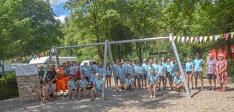Die Volleyballgruppe Memmelsdorf spendete eine Schaukelanlage für den Fitnessparcours in der Nähe des Zeltplatzes und Naturerlebnisbades Rothenkirchen. Vorne links in der Hocke ist Bürgermeister Stefan Heinlein zu sehen, rechts Roland Ringlstetter mit seiner Ehefrau Ursula mit dem Team des Bauhofes und der Verwaltung.
